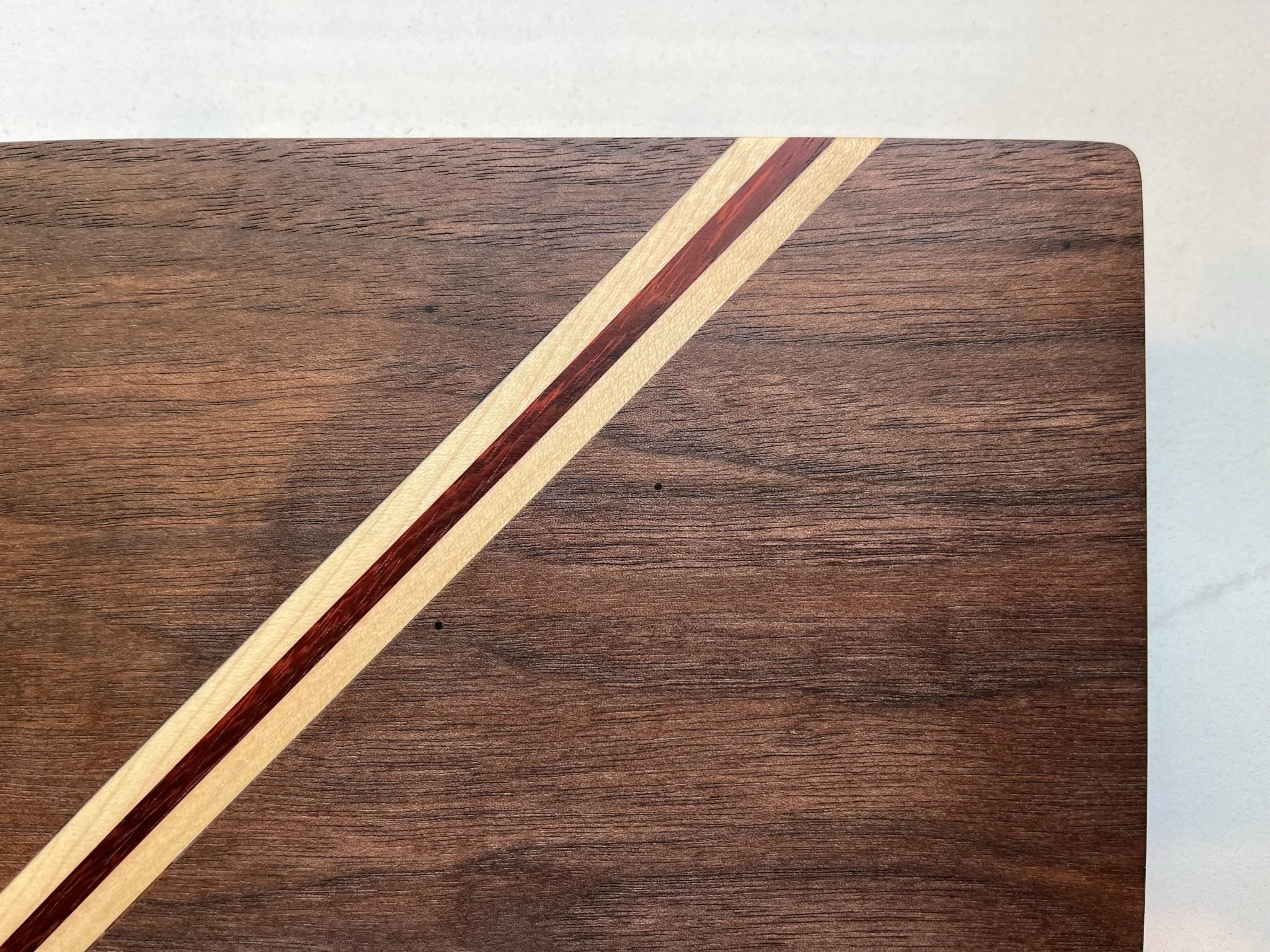 Old World Company - Charcuterie Board. The Talus gets its name from the sloped or curved wall of many castles. The slope was designed as a protection against attacks, but it also added to the beauty of the castle. The Talus charcuterie board has its own curves which adds to its beauty as well as the build in handle to safely transport your food. The Talus comes standard as a solid walnut board and is finished with a combination of food grade mineral oil and wax. Charcuterie board shown here has padouk and maple wood inlay which can be ordered with an up charge.